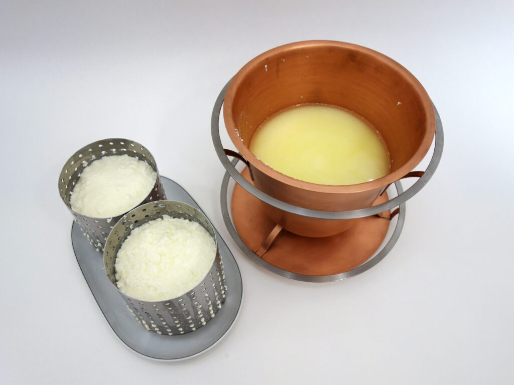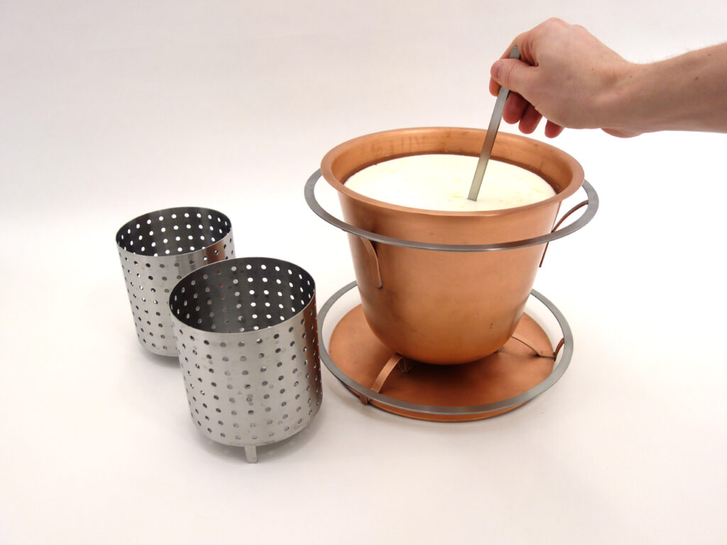 Das archetypische Material des Käsekessels, herkömmlich aus Kupfer, wirkt dauerhaft antibakteriell, führt zu einer gleichmäßigen Erwärmung der Milch und lässt aufgrund verschiedener chemischer Eigenschaften einen ausgezeichneten Geschmack des Käses entstehen.